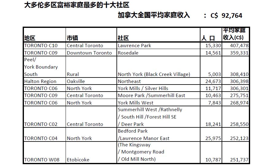 加拿大Spring Data 公司结合加拿大2016年人口统计和大多伦多区地理数据系统,以大数据方法,按平均家庭收入进行分类处理统计,整理出大多伦多地区的十大富人社区和十大低收入社区,公布如下