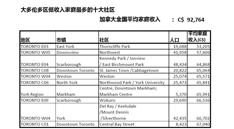 在以上表格列出的低收入社区中,属于华人居多数的施加堡区和万景市中心区均在榜上,共占3席,其中东约克的Thorncliffe Park社区中低收入家庭最多,平均家庭收入远远低于加拿大全国标准。