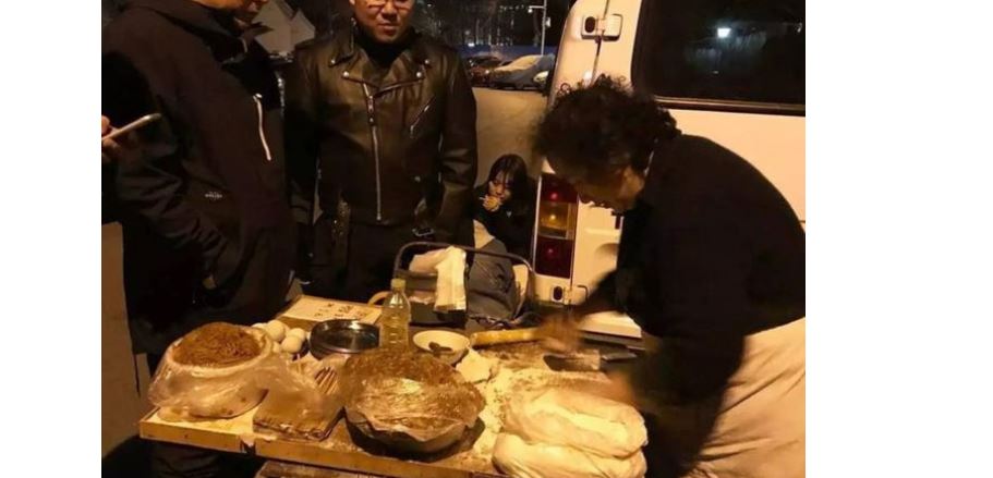 到了深夜11时,一位大妈从远处推著一辆有年头的推车出现,原来大家等的就是阜成门“大妈鬼饼”。